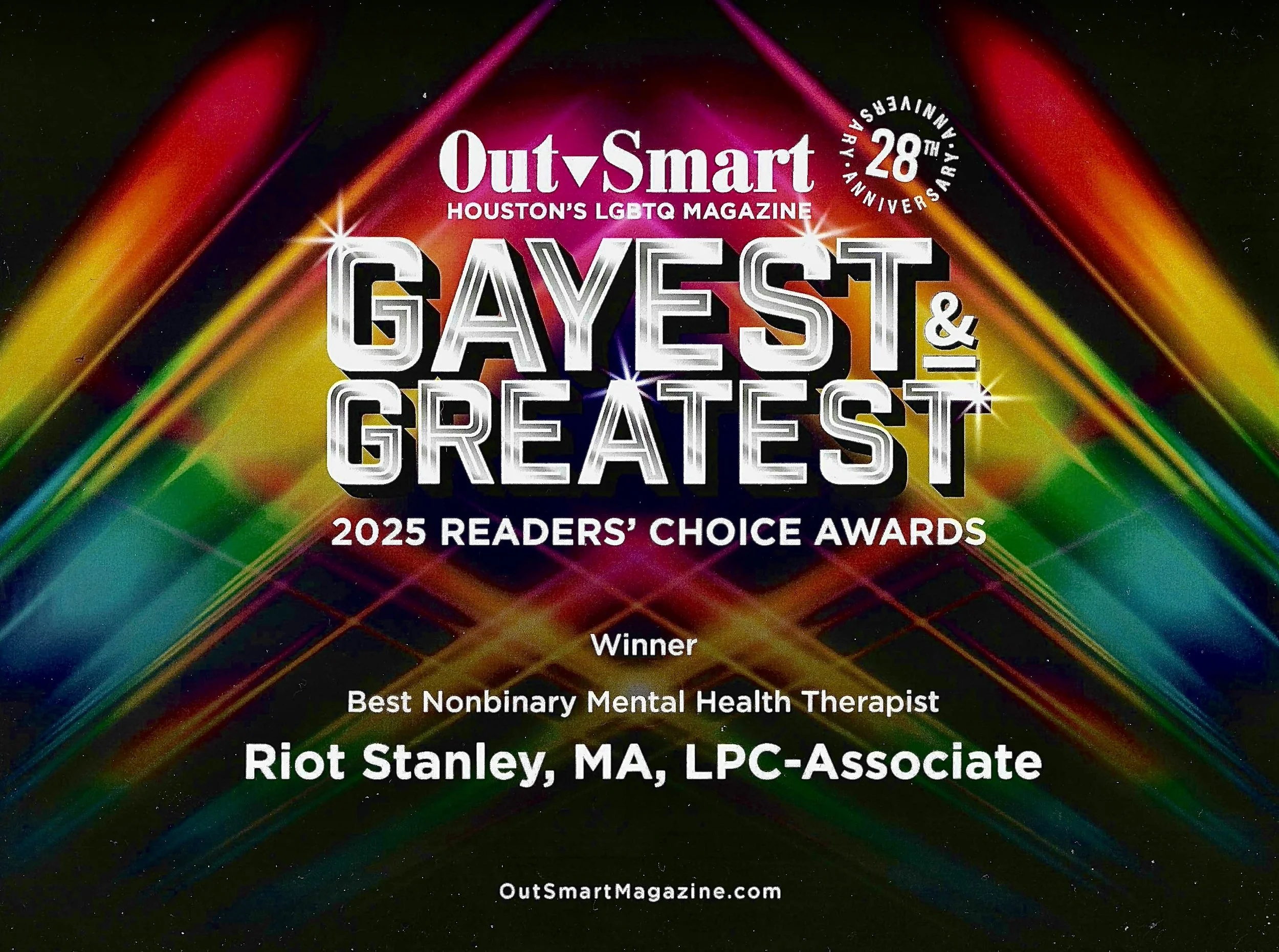 Hi folx! I’m Riot Stanley (they/them), a BIPOC, queer, sparkly, trans non-binary, inked, and hole punched Texas therapist. I hold a Master of Arts in Clinical Mental Health Counseling from Southern New Hampshire University, a CACREP-accredited program, along with a Bachelor of Arts in Psychology from the same institution.